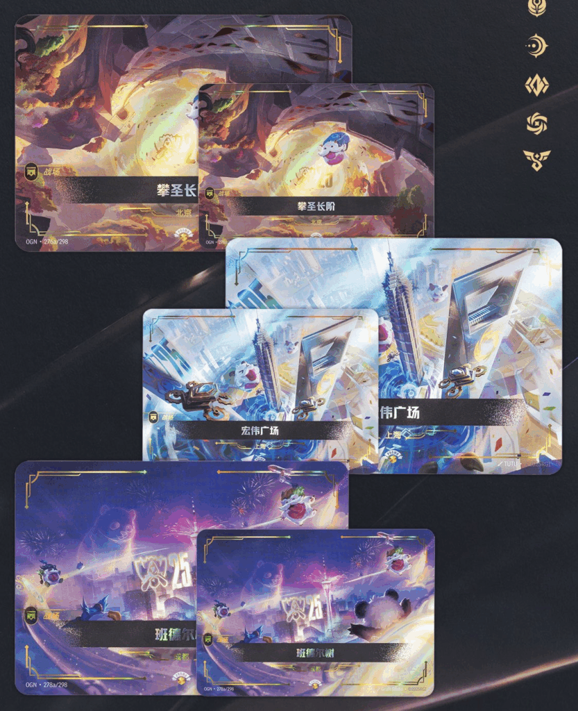 The Riftbound Worlds Bundle 2025 comes with several items. Inside, you'll find a foiled playmat, a matching deckbox, card sleeves, and a Panda Teemo promo card. The bundle also includes three oversized battlefield cards that feature the host cities of Worlds 2025.