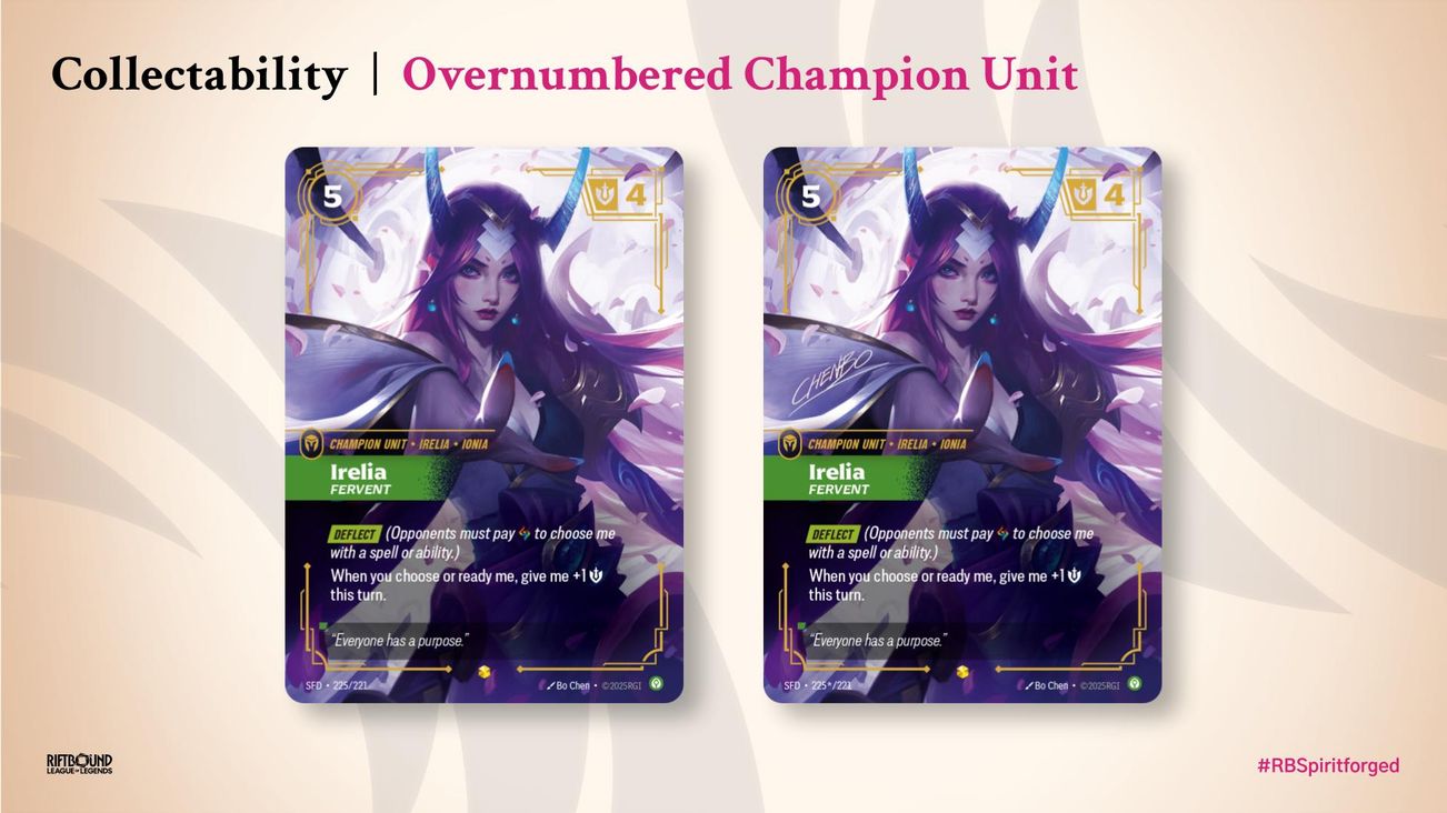 But that’s not all! Some Spiritforged packs will also contain new Overnumbered Champ units for cards originally released in Origins, such as this beautiful new Ahri: